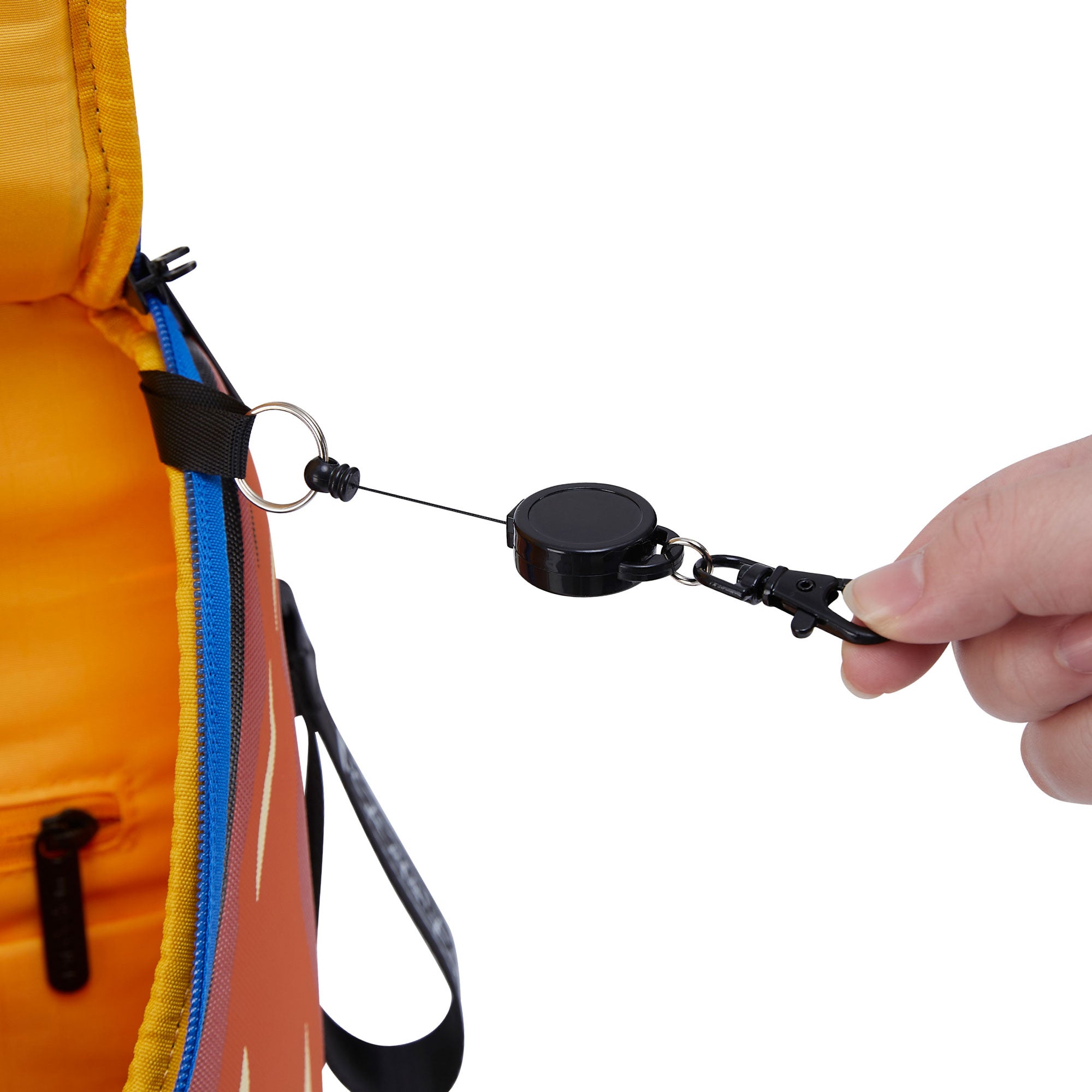 - Front compartment houses a retractable key holder, cardholder, pen pockets, slip pockets, and a zipper pocket.